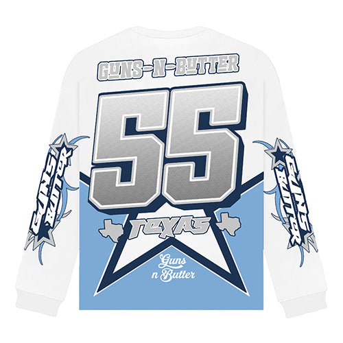 Centered on the chest is the signature silver metallic GNB emblem inside a soft blue ring. Sleeve graphics combine clean whites with blue starburst accents for a balanced, energetic look. Three motorsport-inspired patches across the top bring authenticity and racing heritage into the design.