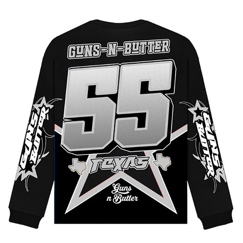 A bold white and silver star motif stretches across the lower half of the crewneck, contrasting sharply against the black fabric. Oversized sleeve graphics in white and silver starburst designs add symmetry and motion. Motorsport-style chest patches in grayscale top off the look, making this edition perfect for fans of minimalist but powerful street aesthetics. It’s sharp, icy, and unmistakably elite.